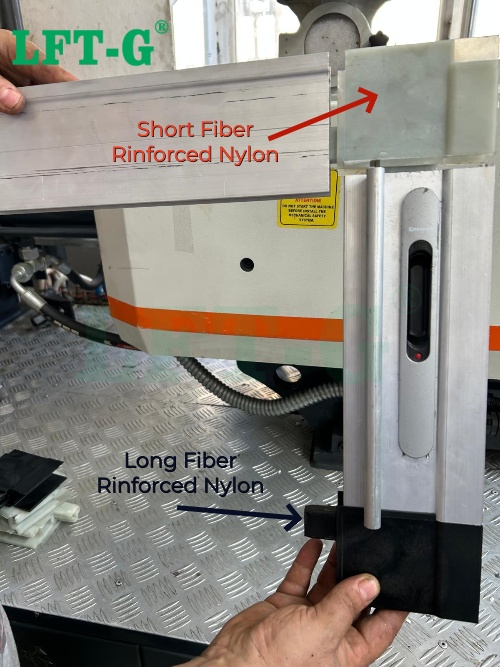 This project demonstrates the successful replacement of a short glass fiber reinforced nylon component with PA6-LGF40 long glass fiber composite in an aluminum profile cutting machine positioning stop.