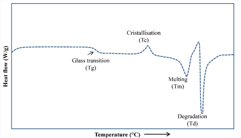 For example, the DSC curve of carbon fiber/PEKK composites shows a small inflection at Tg due to the presence of amorphous regions, by a melting peak at Tm and a crystallization peak at Tc during cooling.